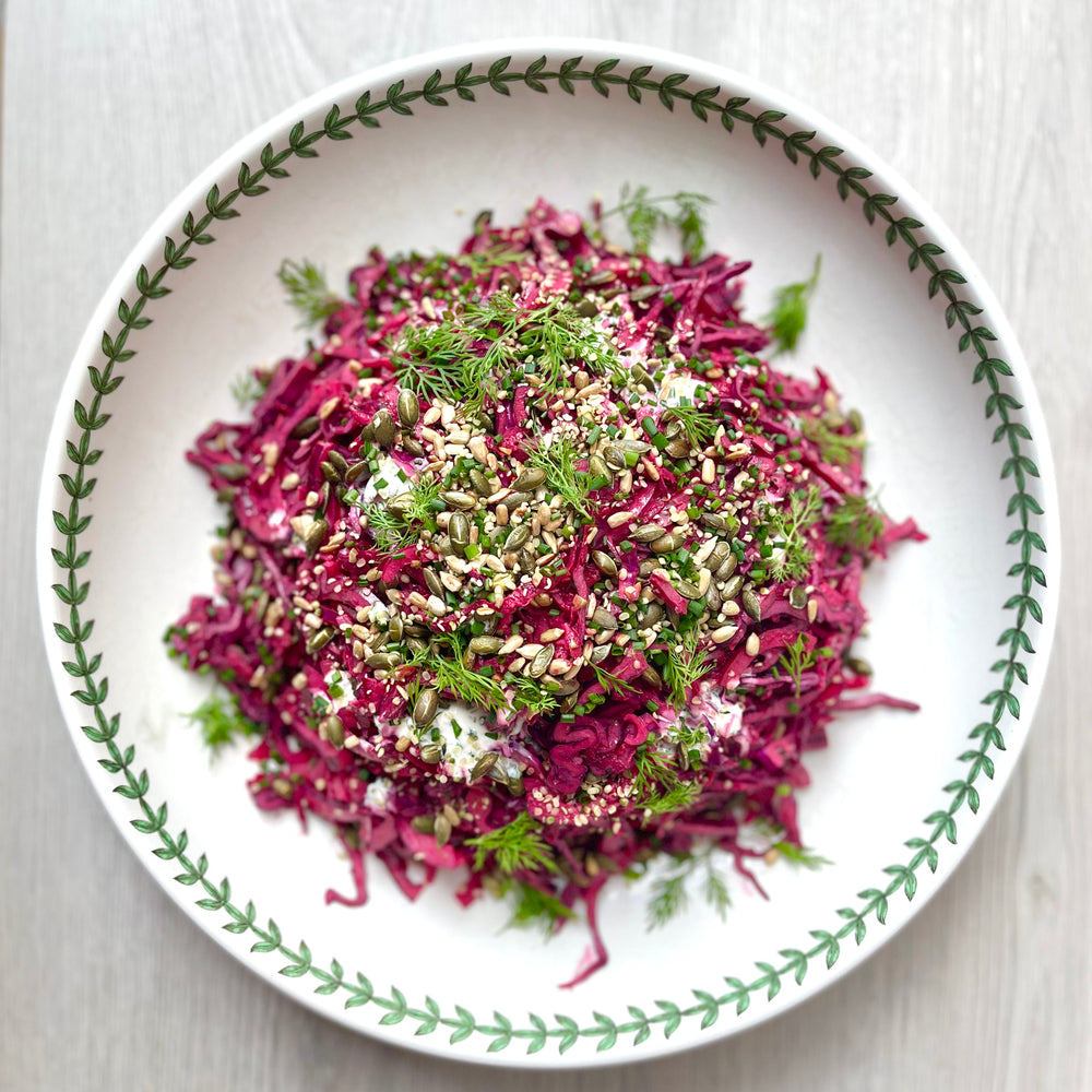 Here’s a recipe for the boldest, brightest coleslaw you’ll see all summer long! Grated beetroot is muddled with finely sliced red onion and shredded red cabbage; these are tossed with a creamy all-purpose dressing, and topped with nutty, crunchy toasted seeds. It’s eye-catching, textural, and goes wonderfully with grilled or BBQ’d fish in particular.