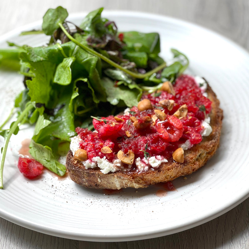 - Spread a generous layer of goats’ cheese onto each bruschetta base, followed by the crushed sweet chilli raspberries.