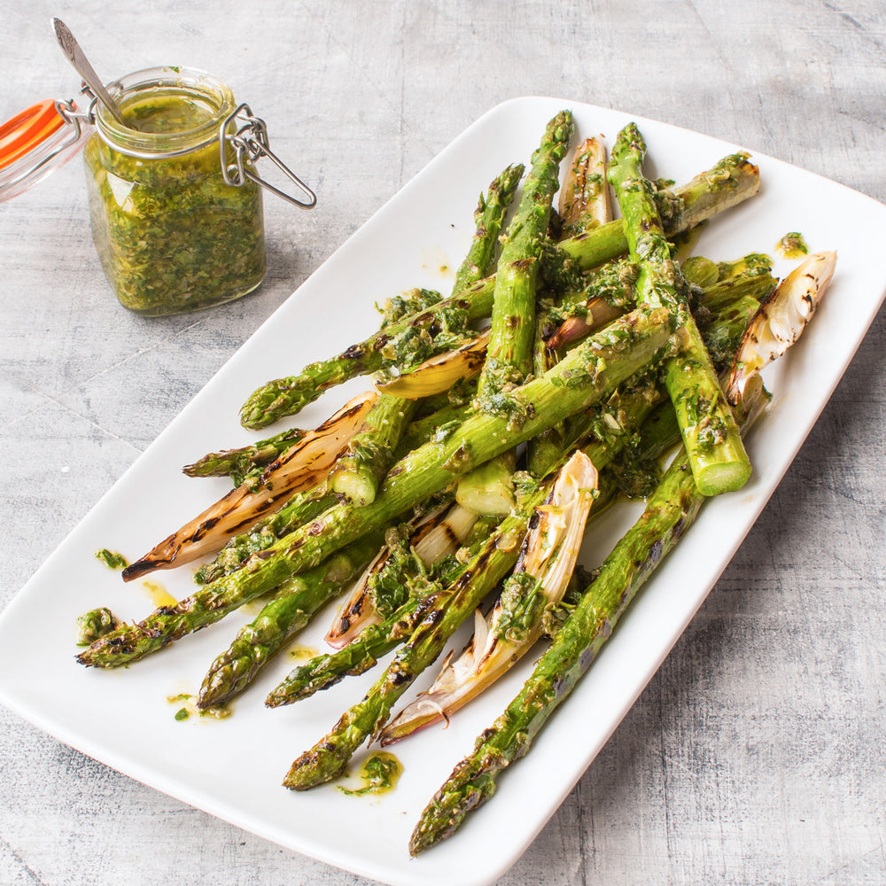 - Arrange the asparagus and echalions on a plate, then spoon over the salsa verde.