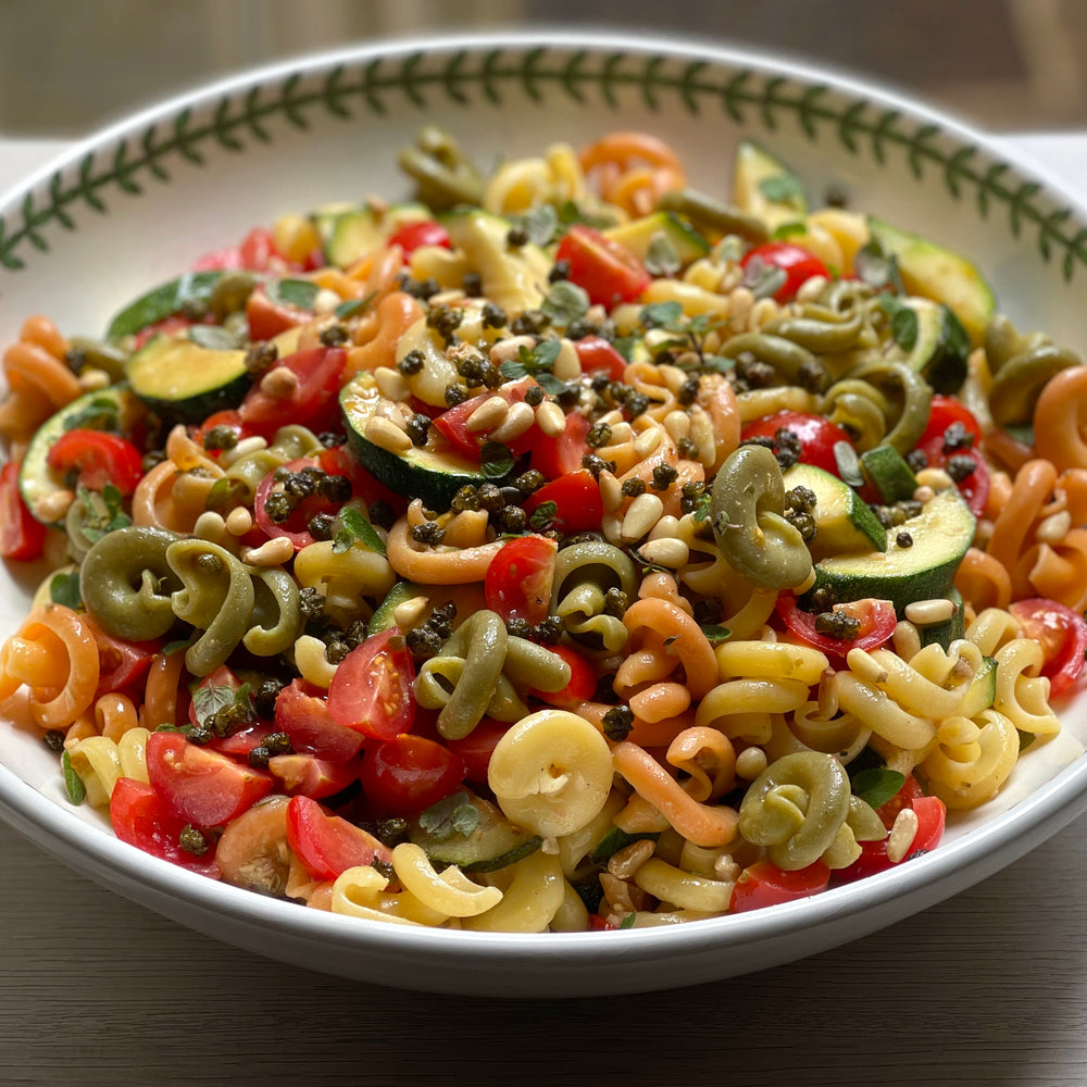 This summer pasta salad packs a real punch, and that’s in large part due to all the flavour bound up in the caper & toasted pine nut dressing. The dressing has a lovely brine-y note from the salty capers, roasted nutty flavours from toasted pine nuts, and a little umami depth from some anchovies, though they are optional. The white wine vinegar brings vivacious acidity that makes the whole salad sing!