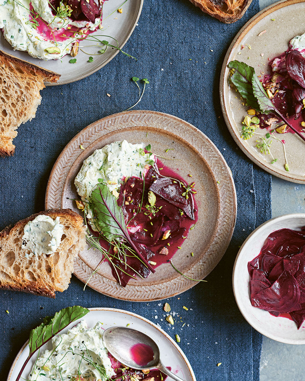 - To serve, spread the labneh over a platter. Drain the pickled beetroot and shake off any excess liquid. Pile it on top of the labneh, then scatter over the pistachios. Finish with some baby pea shoots or salad leaves, or micro-herbs if you can get them. The beetroot juice will bleed into the labneh, so serve straight away for the prettiest effect, with crusty bread for mopping up.