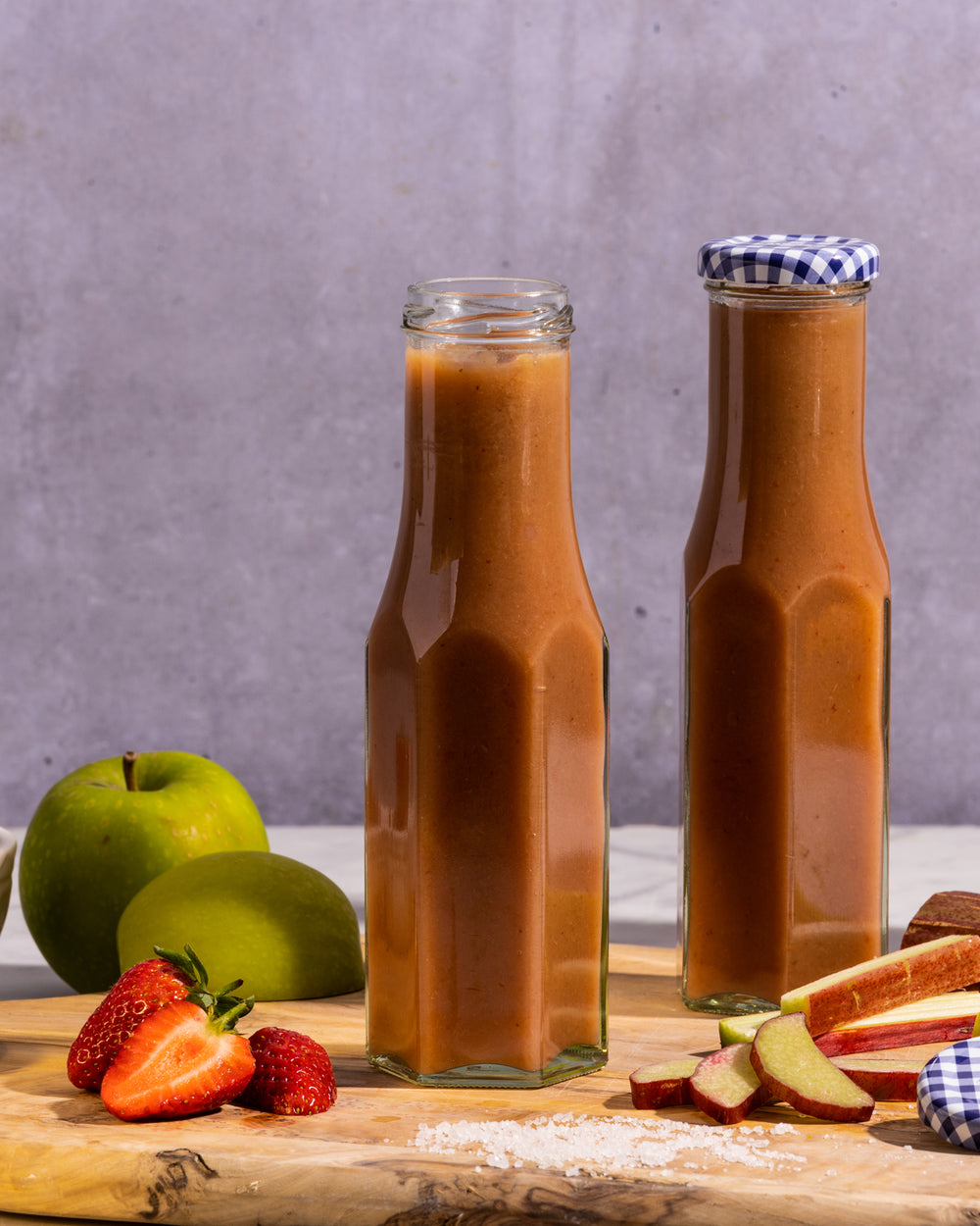 This elegant summery ketchup combines two or our earliest fruits (rhubarb in fact is classified as a vegetable but in general is used as a fruit) to make this highly fruity and vibrant ketchup. Alongside a gorgeous blush of colour, the addition of strawberries brings a fresh and welcome dimension to a ketchup for savoury foods. It is a delicious accompaniment to many things but is particularly good with grilled oily fish — mackerel, sardines salmon; drizzled over grilled Halloumi cheese; served chargrilled lamb chops/kebabs, or mix with a little olive oil to make a light and easy dressing for crisp summer salads.
