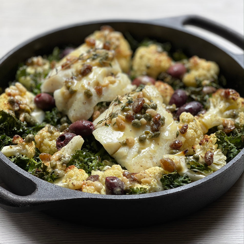 Here’s a “one-tray wonder” that is sure to impress. The variety of textures and flavours is incredible, yet the recipe is very accessible. There’s charred cauliflower, crispy kale, and meaty roasted cod; these delicious, textural ingredients are laced with complex sweet, salty and umami flavours coming from the juicy sultanas, black olives and capers, and anchovies, respectively. There are some roasted pine nuts in the dressing which add further texture and a delicious nutty flavour.
