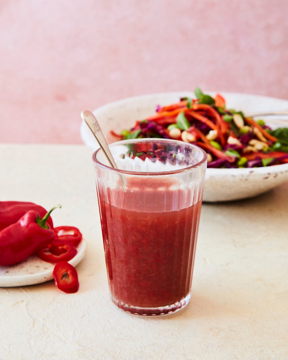 This dressing is flavour dynamite. You can’t find a dressing like it in the shops, and making it at home is a matter of a few minutes’ effort. It is sweet and tangy with a lovely glossy consistency, and lends many dishes a little spike of chilli heat, and the gentle warmth of ginger. It’s super versatile, and will happily keep in your fridge for up to one month in a clean glass jar.